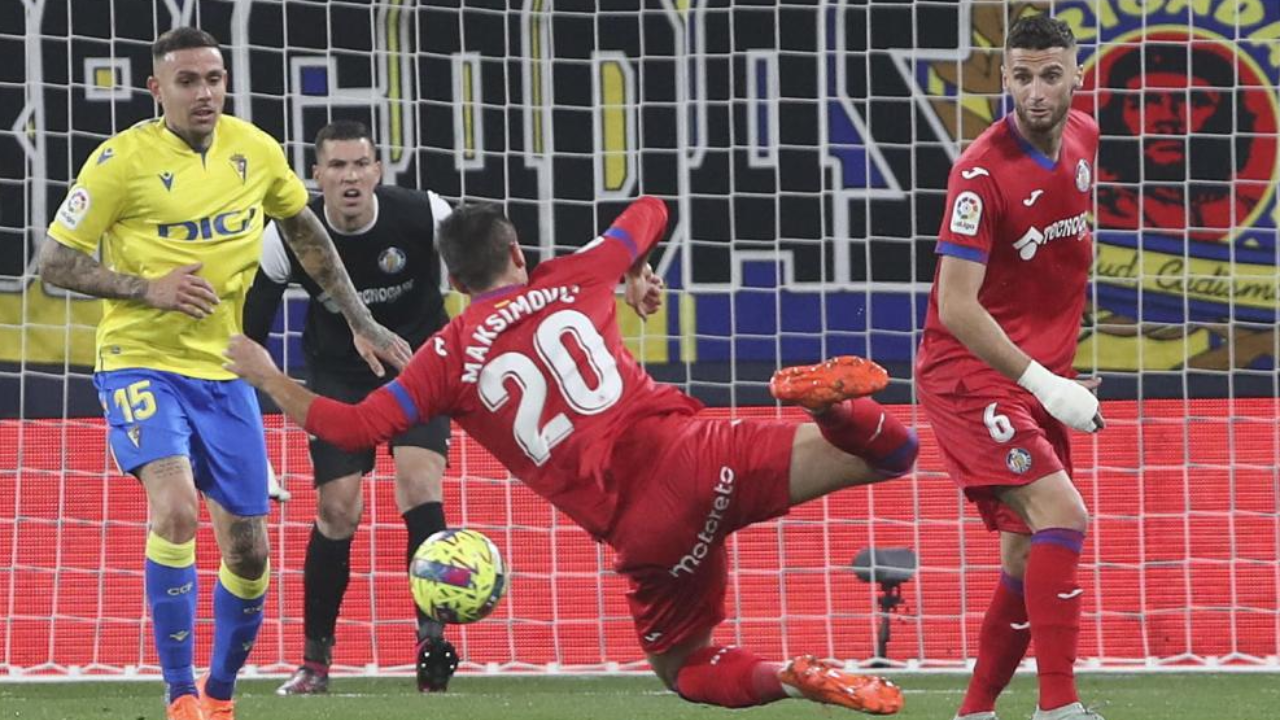O Cádiz empatou esta sexta-feira a dois golos na receção ao Getafe, na abertura da 25.ª jornada da Liga espanhola de futebol, num jogo com três penáltis e duas expulsões, uma delas do central português Domingos Duarte.