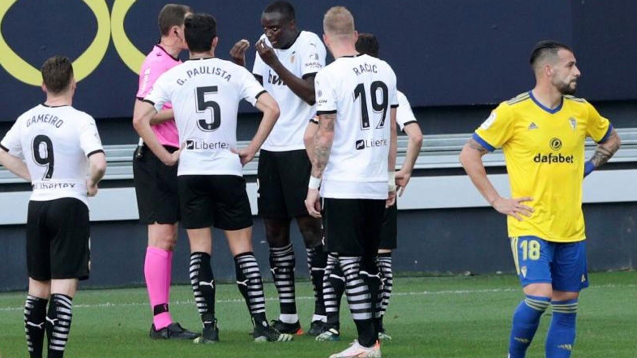 Decorria o minuto 29 do encontro no Estádio Ramón de Carranza, quando, na sequência de um livre a favor do Cádiz, Cala e Diakhaby trocaram argumentos dentro da área valenciana, levando, posteriormente, o central francês a percorrer meio-campo para interpelar o adversário.