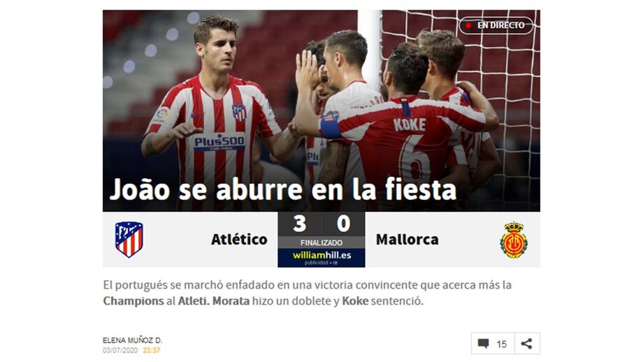 "João, é na área que se ganham as Bolas de Ouro. 'Sonho ganhar a Champions e a Bola de Ouro', dizia durante o confinamento a Kaká, um jogador que ganhou ambos na sua brilhante carreira. E fê-lo graças ao seu excelente trabalho no Milan, onde se converteu num médio ofensivo com chegada e uma definição brutal. E é isso, a definição, que João Félix foi incapaz de fazer. Desde que se destacou diante do Osasuna com um bis, desapareceu e converteu-se num jogador inconsequente. Algo que surpreende em alguém com a sua qualidade. Como o seu gesto ao ser substituído, a golpear a bola contra a bancada. Se há alguém com quem deve estar chateado é com ele mesmo", escreve a 'Marca' numa análise na qual coloca como título "Se o Atlético tivesse o talento de Kubo".