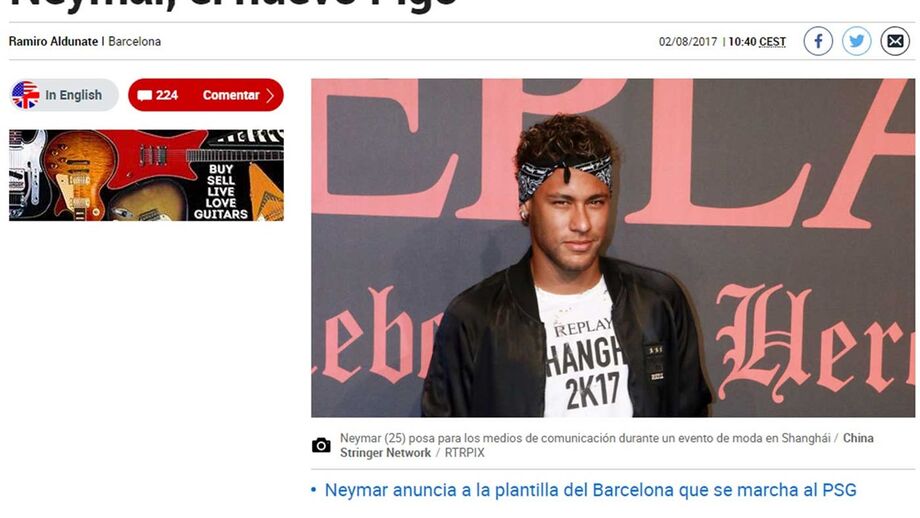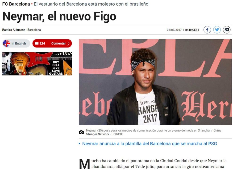 Já na terça-feira junto a Camp Nou foram colocados alguns cartazes apelidando Neymar de 'mercenário' e hoje, após o Barcelona ter confirmado que o avançado, de 25 anos, está de saída do clube, exigindo o pagamento total da cláusula de rescisão de 222 milhões de euros, a imprensa espanhola recorda outro caso que deu muito que falar em Barcelona: o de Luís Figo que no verão de 2000 surpreendeu tudo e todos trocando o Barça pelo Real Madrid.