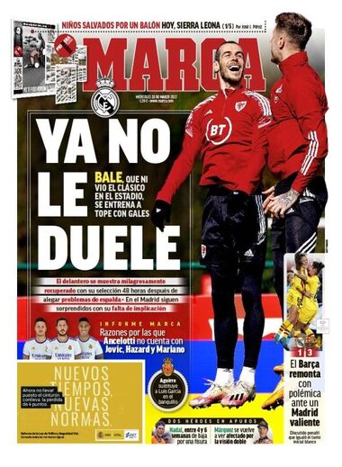 Gareth Bale partilhou nas redes sociais uma mensagem a lamentar a posição editorial da 'Marca', depois de o jornal espanhol ter estranhado o estado de forma do avançado, que no Real Madrid não joga, muito por força das lesões, mas que na seleção do País de Gales se exibe a alto nível. "Já não te dói', escrevia em manchete o diário de Madrid na edição de anteontem.