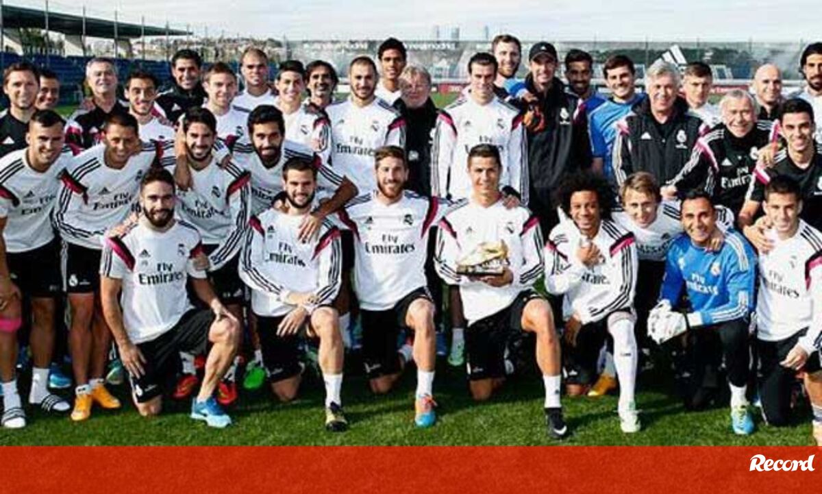 O futebolista português Cristiano Ronaldo partilhou esta quinta-feira com os seus companheiros, durante o treino do Real Madrid, a Bota de Ouro que recebeu na quarta-feira, para o premiar como melhor marcador dos campeonatos europeu em 2013/14.