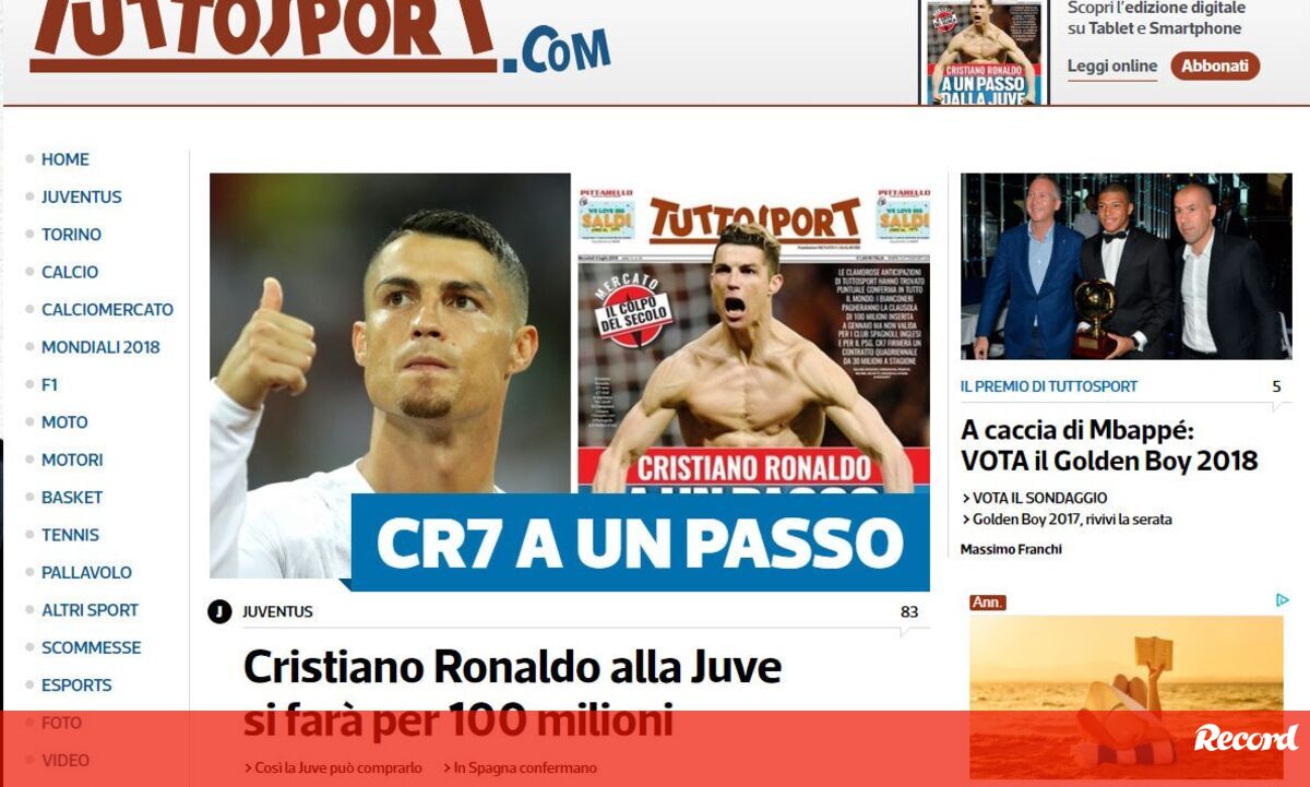 O 'plano' da Juventus para financiar a contratação de Cristiano Ronaldo contempla duas soluções principais. Num negócio avaliado em 220 milhões de euros - 100 para pagar a transferência ao Real Madrid e os restantes 120 para o salário, dividido por quatro temporadas -, o heptacampeão italiano tem em mente, segundo o 'AS', aumentar os patrocínios e faturar em vendas.