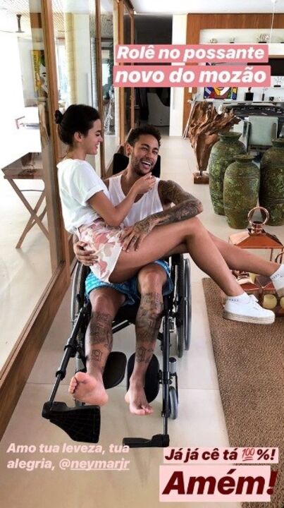 "Já já você está 100%! Amém!", escreveu a atriz nas redes sociais, juntamente com um "amo tua leveza, tua alegria", como legenda da fotografia em que se vê Bruna Marquezine ao colo de Neymar.