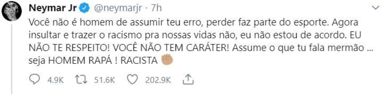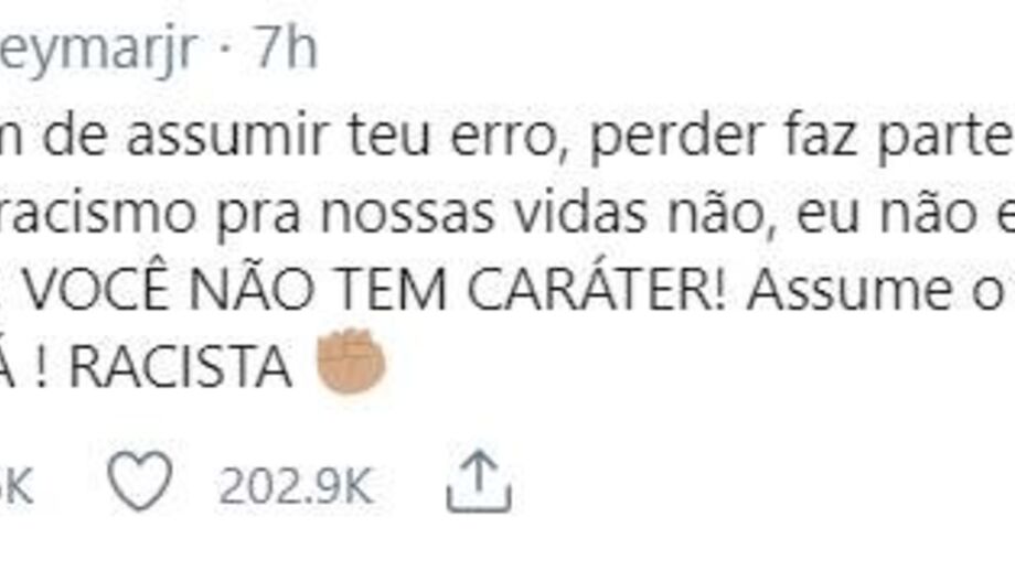 "Tu não és não homem para assumir o teu erro, perder faz parte do desporto. Agora insultar e trazer o racismo para as nossas vidas não, não estou de acordo. Eu não te respeito! Tu não tens caráter! Assume o que falas, meu irmão... Sê homem, rapaz! Racista", escreveu.