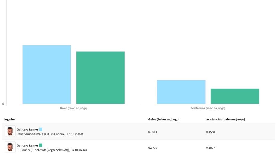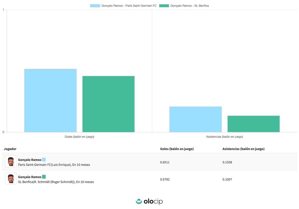 A 'Olocip', empresa de Inteligência Artificial aplicada ao futebol lançada por Estebán Granero, ex-médio do Real Madrid, utilizou a transferência de Gonçalo Ramos para fazer uma previsão do rendimento que o avançado terá com base nos pressupostos de uma equipa treinada por Luis Enrique. Um golo a cada 138 minutos e uma assistência a cada 577' no campeonato é a conclusão apresentada pelo algoritmo da 'Olocip' e que engloba dados do técnico, colegas de equipa e adversários, entre outras variáveis. E, claro, do próprio Gonçalo Ramos.