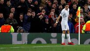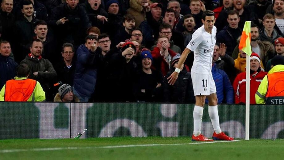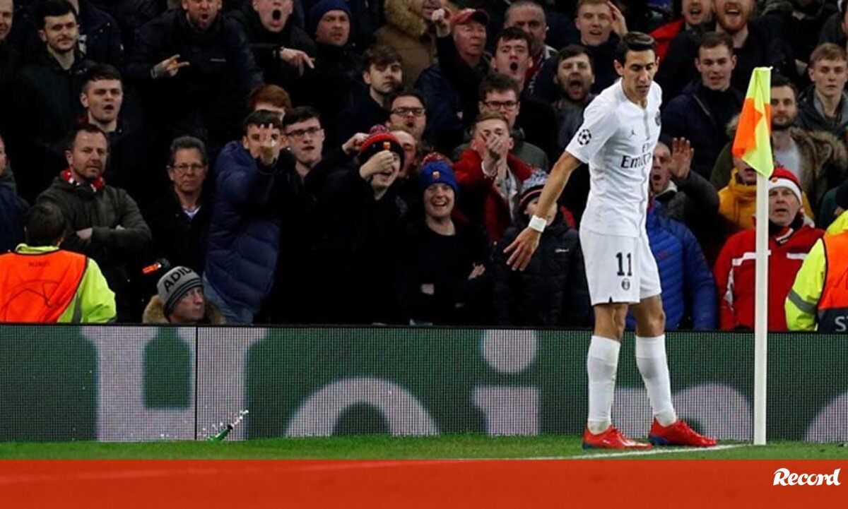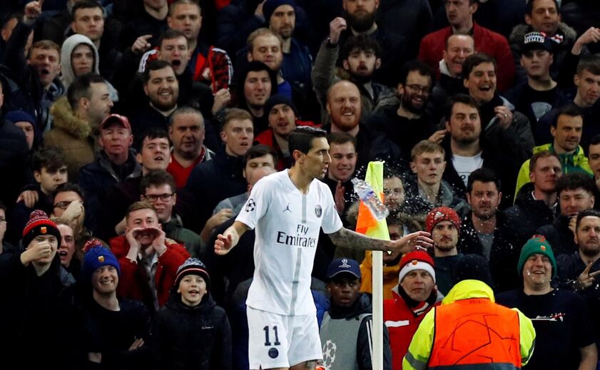 No Estádio Old Trafford, em Manchester, a garrafa de plástico foi atirada na direção do argentino Angel Di María, ex-jogador da equipa inglesa, que a apanhou e fingiu beber.