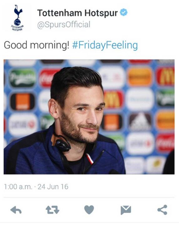 Vamos por partes. Enquanto a Grã-Bretanha acordava com a confirmação do Brexit, o Tottenham publicava, às 8 da manhã, um tweet aparentemente inocente a desejar os bons dias aos seus seguidores naquela rede social com uma fotografia do sorridente guarda-redes francês Hugo Lloris. "Bom dia! #FridayFeeling", podia ler-se na mensagem.