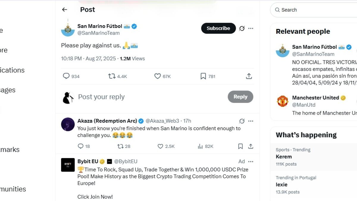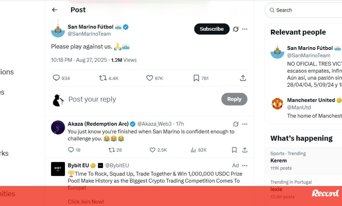 Foi o caso da conta de X da seleção de São Marino, conhecido à escala global por raramente vencer um jogo. Na publicação do Manchester United a dar conta da eliminação da Taça da Liga, às mãos do modesto Grimsby, a seleção de São Marino comentou – “Por favor, venham jogar connosco”.
