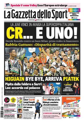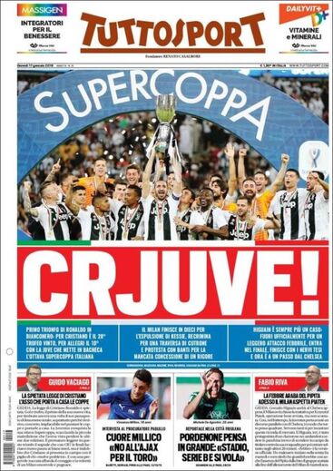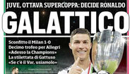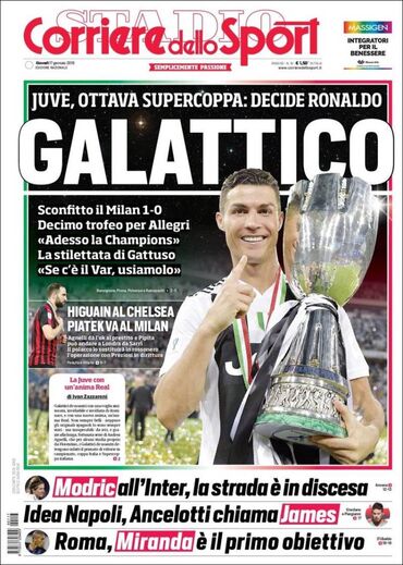 Ronaldo ajudou a Juventus a vencer a oitava Supertaça - um recorde - e os desportivos do país destacaram o luso. "Galáctico!", "CR... e vai uma" ou "CRJuve" lê-se nas manchetes. O astro tem Itália a seus pés!