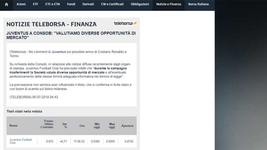 Com os rumores da imimente contratação de Cristiano Ronaldo a intensificarem-se, a Juventus viu-se obrigada pelo regulador italiano - o equivalente à Comissão do Mercado de Valores Mobiliários em Portugal - a emitir um comunicado a esclarecer as notícias que têm vindo a público. No entanto, o clube transalpino deixou tudo 'na sombra', limitando-se a deixar algumas notas pouco concretas.