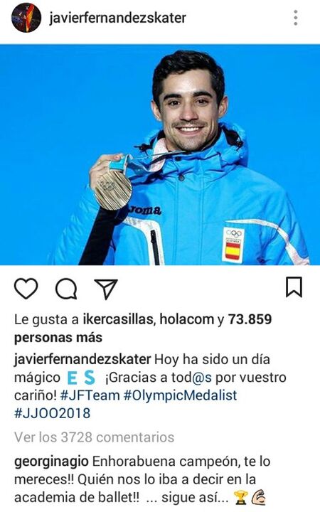 No Instagram, Javier Fernández publicou uma fotografia sua com a medalha ao peito, agradecendo todo o apoio recebido: "Hoje foi um dia mágico", escreveu na legenda. O 'post' do patinador recebeu mais de 75 mil 'likes' e 3.500 comentários, entre os quais o de Georgina Rodríguez.