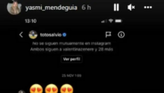 Continua a dar que falar a situação que envolveu Toto Salvio e Magali Aravena. Agora foi a vez de Yasmi Mendeguía, uma antiga concorrente do Big Brother argentino, ter partilhado nas redes sociais mensagens elogiosas recebidas do ex-jogador do Benfica, nas quais Toto questiona por duas vezes (sem sucesso) se esta estava bem, antes de a elogiar com um "tu, sim, não tens rival".