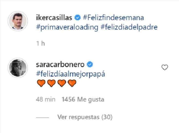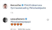 Sara Carbonero publicou quatro corações e uma hashtag "feliz dia ao melhor papá" e Casillas respondeu pouco depois também com mais emojis carinhosos, reforçando assim aquilo que o antigo internacional espanhol havia sublinhando aquando do anúncio da separação: "o respeito, afeto e amizade continuarão sempre".