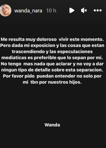 "Não tenho mais nada a acrescentar nem vou dar mais nenhum detalhe sobre esta separação. Por favor, peço que entendam que não se trata apenas de mim, mas também dos nossos filhos", acrescentou Wanda Nara, que também empresária de Icardi.