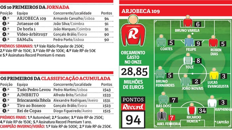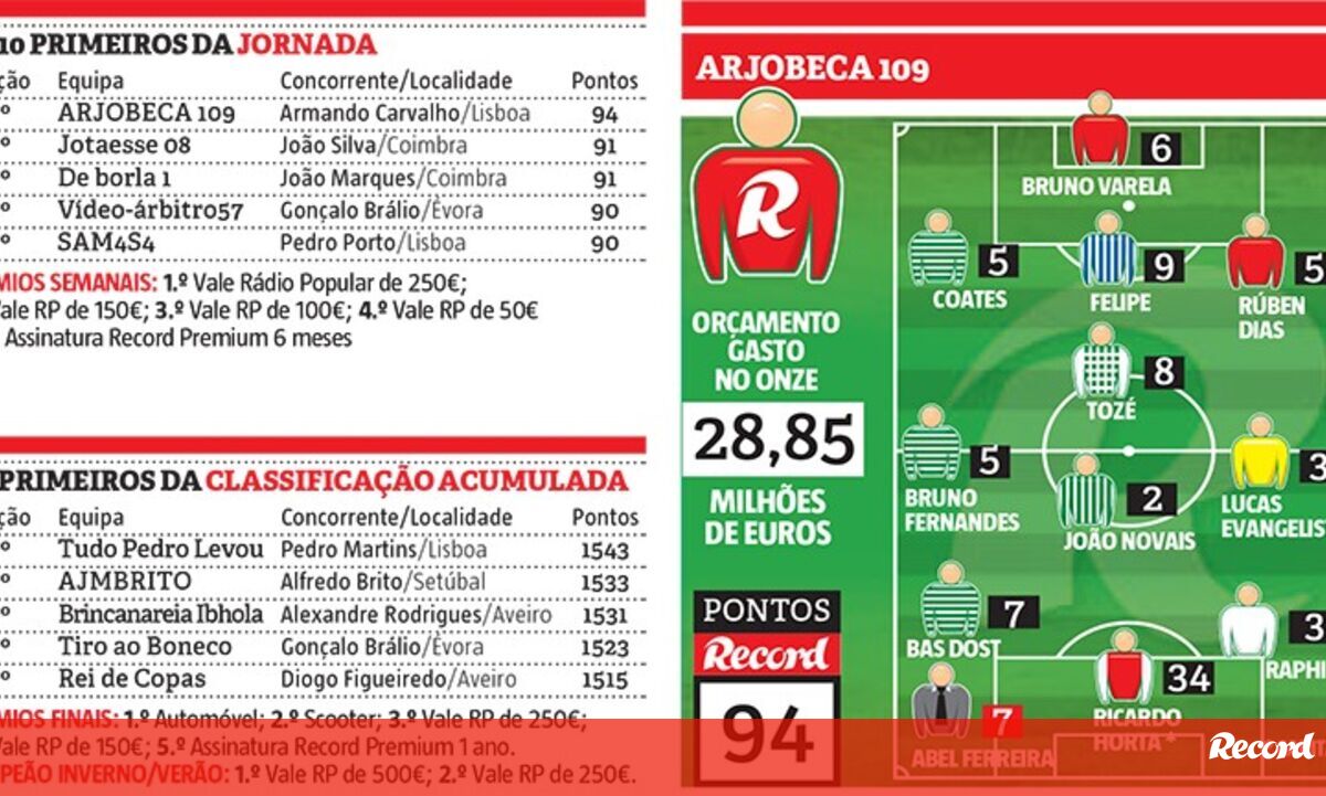 Com a soma de 94 pontos, o treinador do Arjobeca 109, Armando Carvalho, é o grande vencedor da 23ª ronda da Liga Record. O lisboeta, participante assíduo e antigo campeão do concurso, beneficiou da escolha de Ricardo Horta como capitão de equipa. O extremo do Sp. Braga bisou em Chaves (fez ainda uma assistência no triunfo folgado por 4-1) e foi eleito como o Jogador da Semana, pelo que contribuiu com 34 pontos para a equipa vencedora. Apostando num misto com jogadores dos três grandes – Bruno Varela e Rúben Dias (Benfica), Coates, Bruno Fernandes e Bas Dost (Sporting) e Felipe (FC Porto) –, Armando Carvalho impôs-se à concorrência.