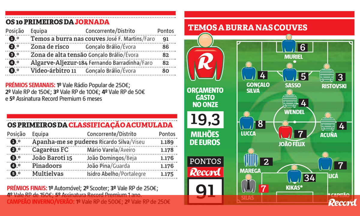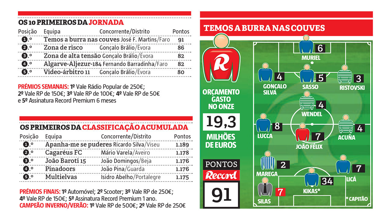Com 91 pontos, o treinador de sofá ficou a cinco pontos da concorrência mais direta, com a aposta em Kikas como capitão a ser o principal destaque na estratégia de José Francisco Martins. O avançado do Belenenses bisou na vitória ante o Feirense (4-0), mas também Muriel, Gonçalo Silva, Sasso, Lucca, Licá e Silas mereceram a confiança. O outro jogador que mais pontuou na equipa vencedora foi João Félix.