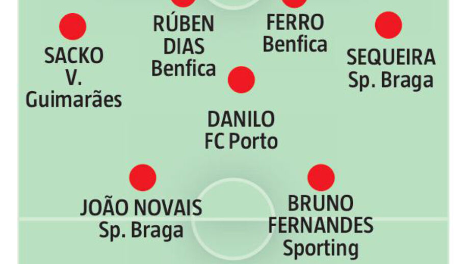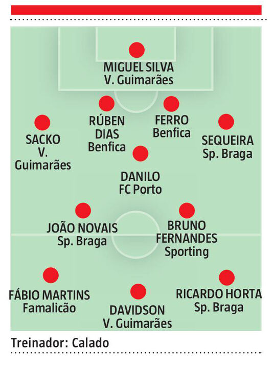 Entre a extensa lista de jogadores à disposição, o mais fácil foi mesmo a eleição do guarda-redes: Miguel Silva, um dos responsáveis pelo bom arranque de temporada do V. Guimarães. "É um jovem com muito valor. Consoante a sua evolução, pode ser um guarda-redes que no futuro fará parte do plantel de um dos grandes do futebol português", aferiu. Ora, à sua frente, Calado apostou noutro vimaranense, Sacko, e completou a sua linha defensiva com uma dupla de centrais ‘made in Seixal’ - as águias Rúben Dias e Ferro - e ainda o regular Sequeira, do Sp. Braga. "É uma defesa jovem, mas com muita qualidade. Aliás, a média de idades deve rondar os 23 ou 24 anos", sublinhou.