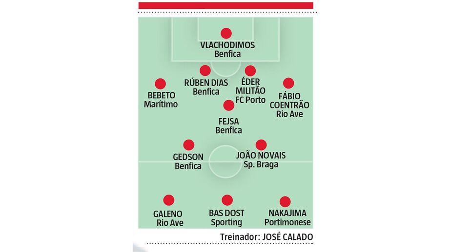 Faltava apenas decidir o trio da frente mas até esse momento Calado tinha cumprido com o objetivo inicial: não gastar muito para poder investir forte num goleador. "Começo por escolher os homens para as alas, dois que não alinham nos candidatos ao título mas têm muita qualidade. Na direita, o Galeno, do Rio Ave, vai ser aposta do FC Porto no futuro. Na esquerda, o Nakajima, do Portimonense, rapidíssimo e marca golos. A ponta-de-lança, como o Jonas não está a jogar, coloco o Bas Dost", rematou.