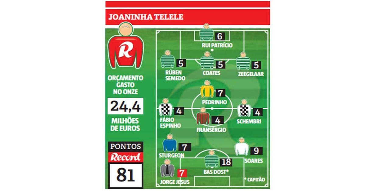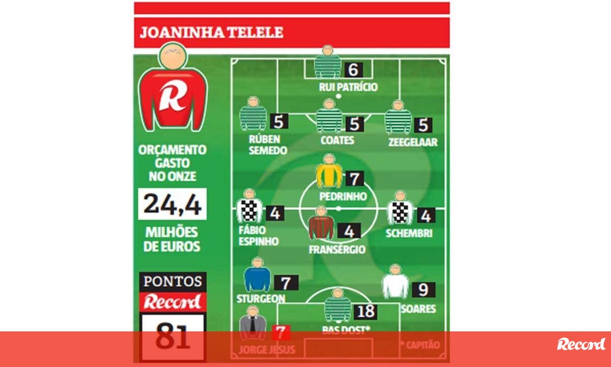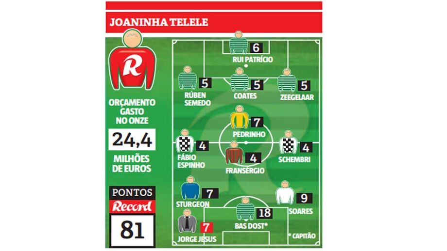 O treinador da Joaninha Telele, de 48 anos, formou uma equipa em 3x4x3, exclusivamente leonina na defesa, com um meio-campo de primeiros planos de equipas do meio da tabela e um ataque particularmente produtivo na 10ª jornada da Liga NOS – além de Bas Dost, incluiu o vimaranense Soares (bisou ao Nacional) e Sturgeon (marcou o golo da vitória do Belenenses em Santa Maria da Feira).