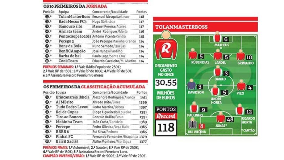 Numa jornada na qual o benfiquista Jonas valeu 48 pontos a quem o colocou como capitão, João Mesquita beneficiou dessa ajuda do brasileiro mas também acertou em cheio em alguns jogadores bem pontuados. Casos dos defesas do Benfica e dos atacantes do Sp. Braga, pois só com a dupla Paulinho/Ricardo Horta fez mais 21 pontos.