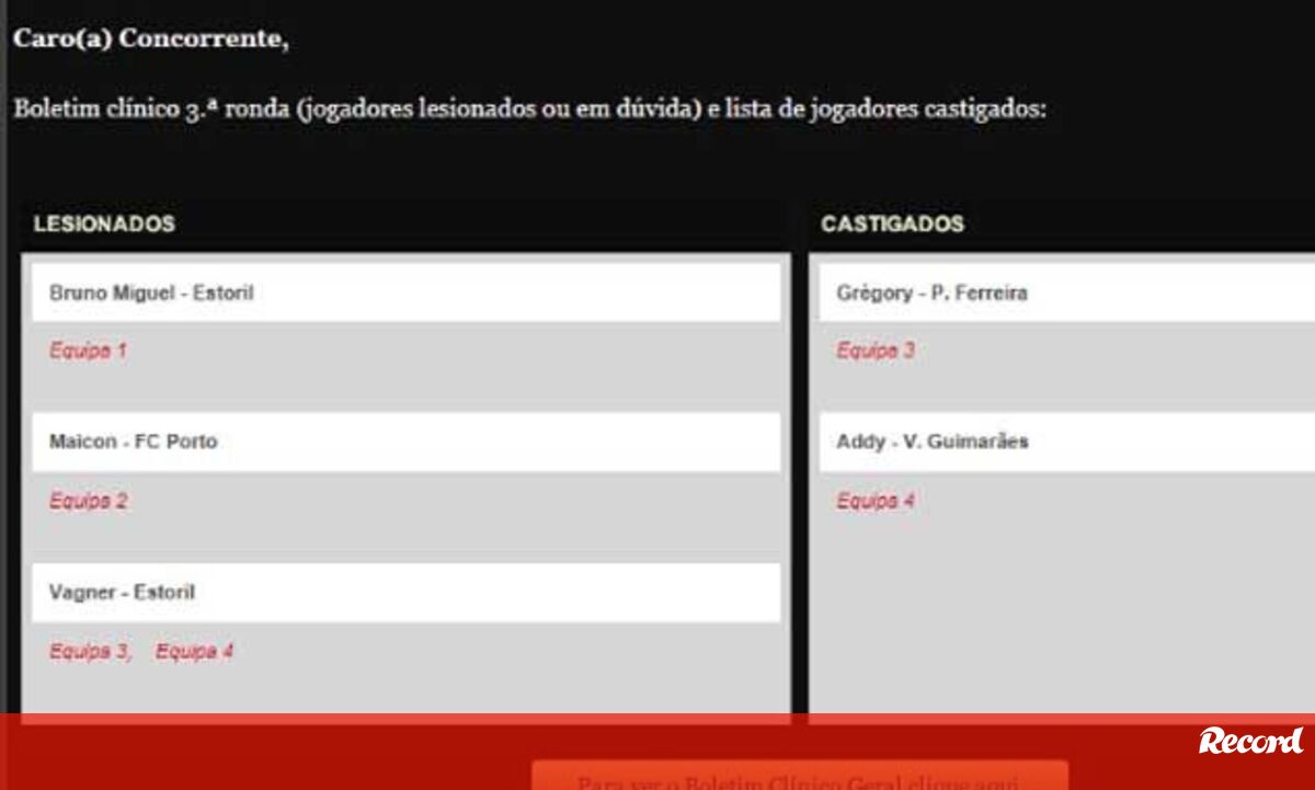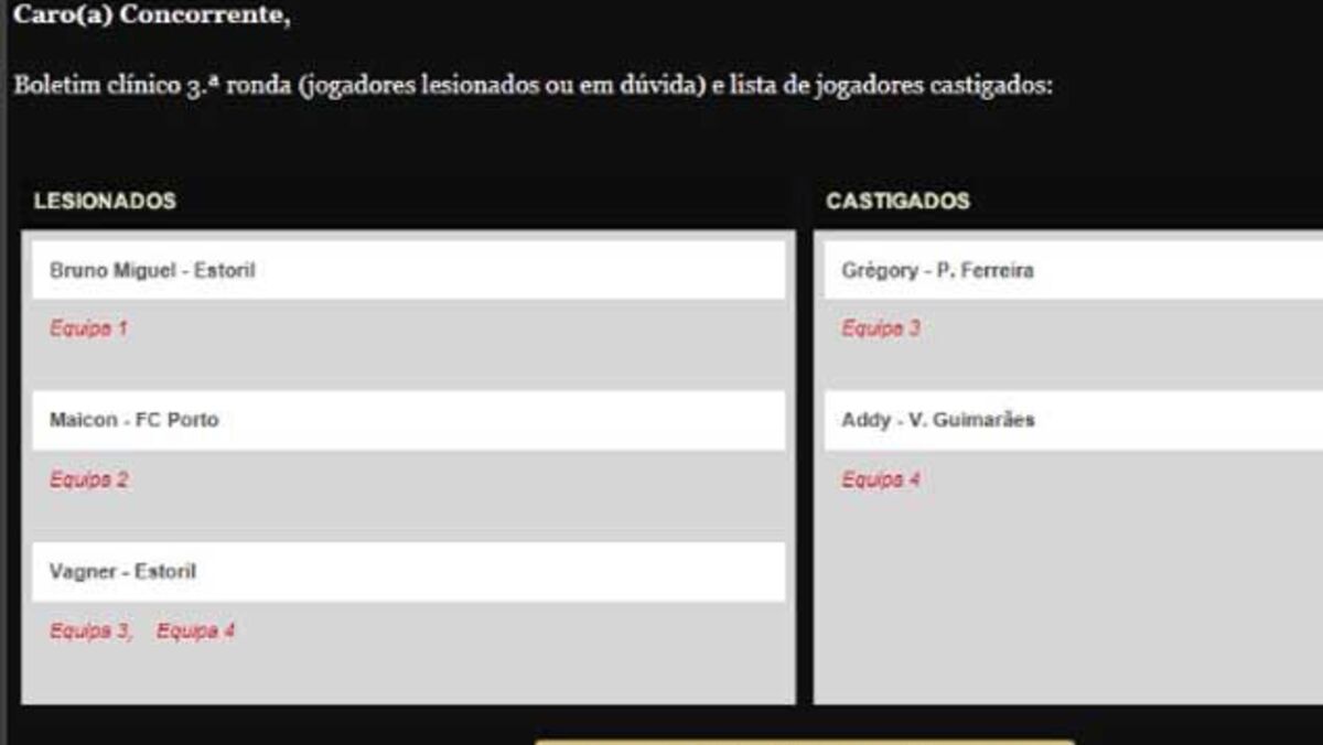 Ao inscrever-se receberá semanalmente vários conteúdos relativos aos castigos e lesões e estatísticas sobre o rendimento das equipas.