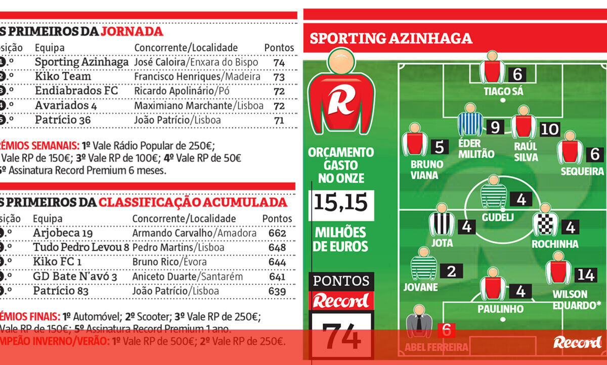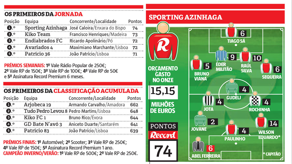 José Caloira é o vencedor do prémio semanal da 11ª ronda da Liga Record 2018/19, correspondente à 15ª jornada da 1ª Liga. O concorrente residente em Enxara do Bispo, Lisboa, vai receber um vale de 250 euros da Rádio Popular graças aos 74 pontos somados com a equipa Sporting Azinhaga, total que lhe permitiu vencer por apenas um ponto nesta ronda.