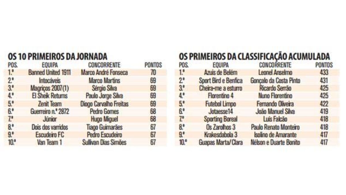 O concorrente de Lisboa somou 70 pontos, apenas mais um do que quatro rivais, e vai receber uma PS4. Apesar de ser adepto do Benfica, Marco Fonseca apostou em onze jogadores do Rio Ave – que bateu a Académica, por 3-0, na última partida da jornada – e acertou em cheio na escolha de Hassan para capitão. O avançado bisou e atingiu os 18 pontos, decisivos para o triunfo.