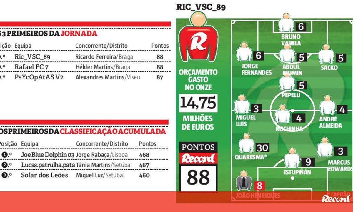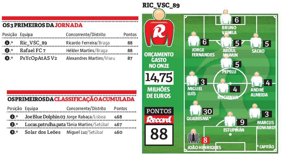O grande vencedor da 7ª ronda da Liga Record apenas foi encontrado através do... orçamento. Os dois melhores da semana tiveram os mesmos 88 pontos, mas o onze de Ricardo Ferreira custou 14,75 milhões, menos três do que o de Hélder Martins, que ficou perto de conquistar o 1º prémio.