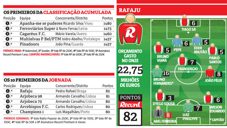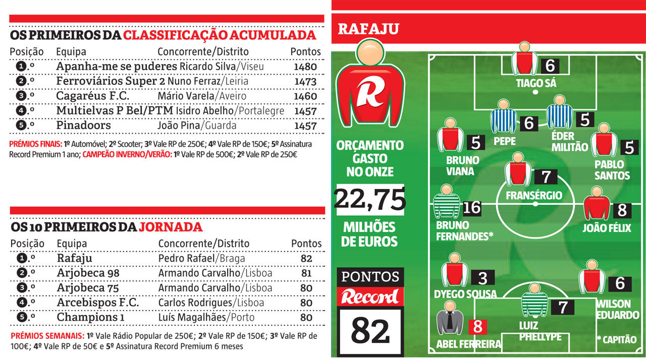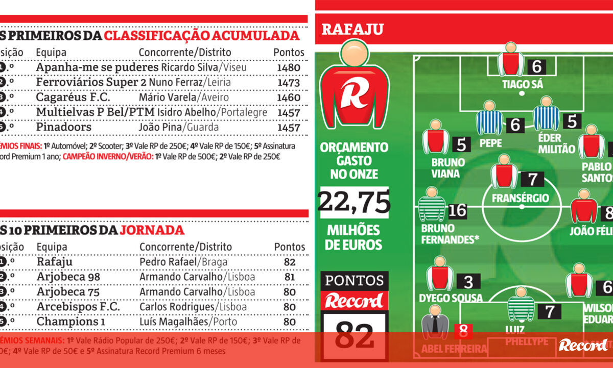 Pedro Rafael é o grande vencedor do prémio semanal da 25ª ronda da Liga Record. O concorrente de Braga somou 82 pontos numa jornada muito renhida. O treinador de bancada vencedor somou apenas mais um ponto do que o segundo classificado e mais dois do que os seguintes seis participantes.