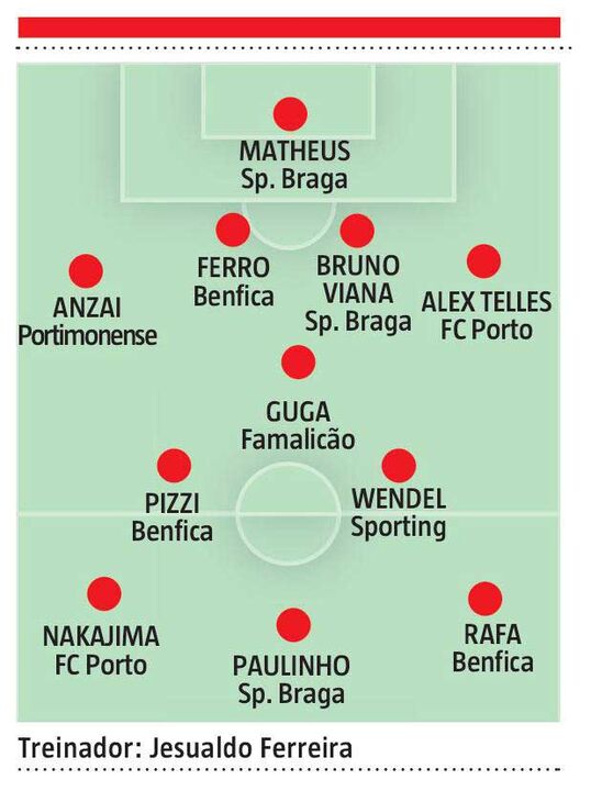 No ataque, Rafa foi mencionado de imediato, Nakajima também acabou por ser chamado ao onze, enquanto ainda faltava alguém como referência. "Quem é que posso escolher como ponta-de-lança? Quem é que pode ser? Ah, o Paulinho! Bom jogador, assenta bem na equipa e deixa tudo fechado. Dá para o orçamento? Então está bom!", adiantou o treinador, agora também comentador no Canal 11. Aí está uma possível fórmula de sucesso para mais uma edição do jogo interativo do nosso jornal. Palavra do professor. "Isto é equipa para ganhar tudo!", rematou Jesualdo Ferreira, numa conversa bem-disposta.
