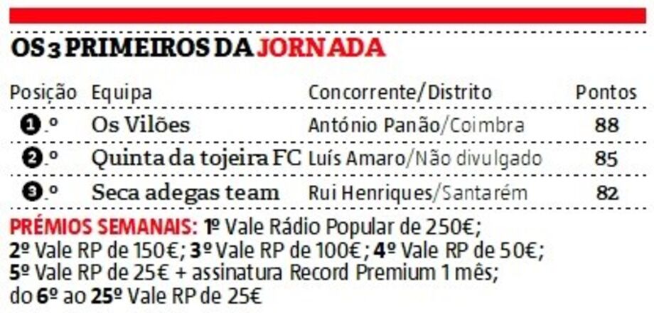 António Panão é o vencedor do prémio semanal da 2ª ronda da Liga Record 2020/21. O concorrente de Formoselha, Montemor-o-Velho, somou 88 pontos com a equipa ‘Os vilões’ e venceu com uma vantagem de três pontos sobre Luís Amaro. Pelo triunfo, António Panão vai receber um vale de 250 euros da RP.