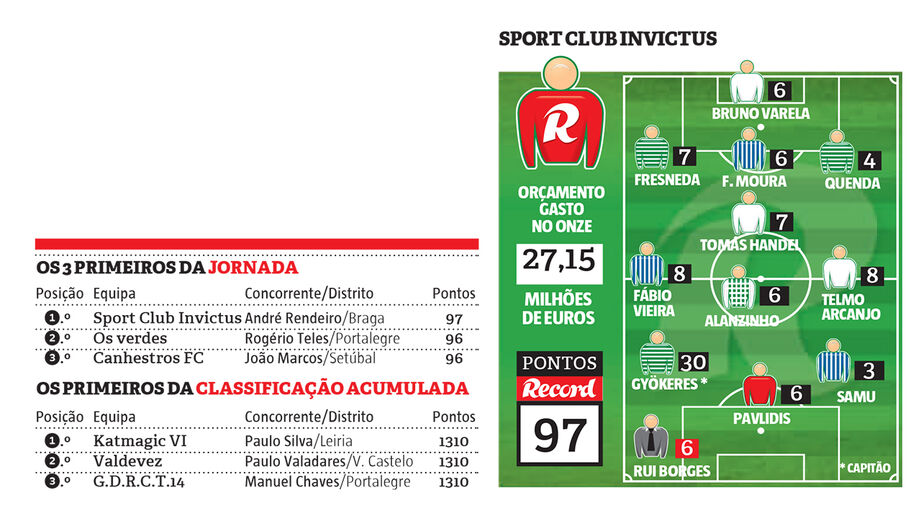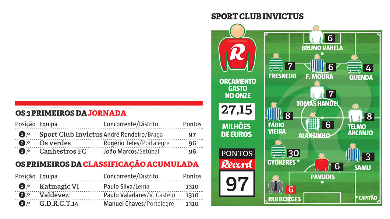 André Rendeiro, de Ronfe, Guimarães, é o vencedor do 1º prémio semanal da ronda 22 da Liga Record 24/25. Oconcorrente entrou em campo com jogadores de 5 clubes e um trio de ataque demolidor, com o goleador de cada um dos candidatos ao título:Gyökeres – dobrou a pontuação por ser capitão de equipa – Pavlidis e Samu.