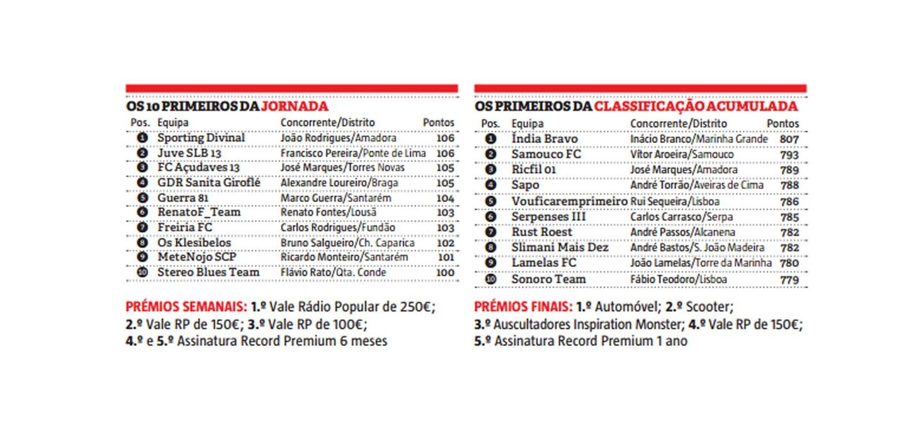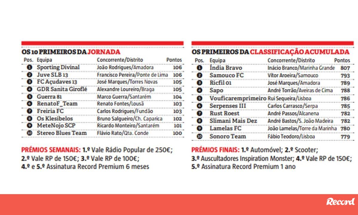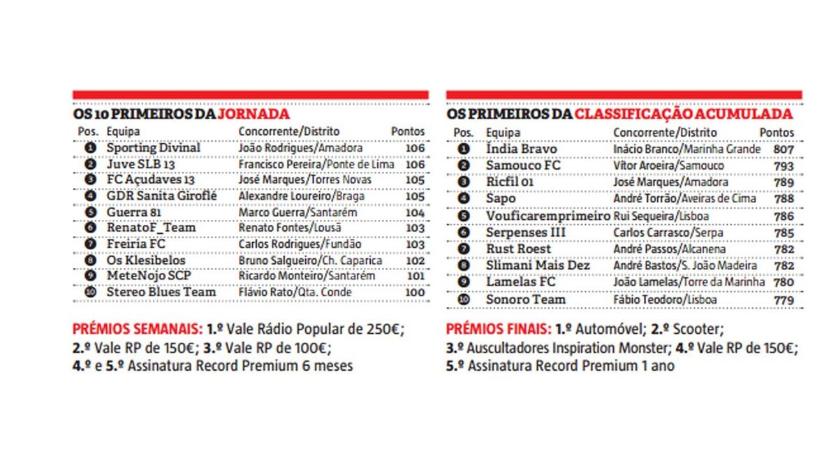 João Manuel Rodrigues, de 54 anos, é o vencedor da 13ª ronda da Liga Record. Este treinador de bancada, da Amadora, somou 106 pontos com a equipa ‘Sporting Divinal’, batendo ao 2º classificado Francisco Martins Pereira (também com 106 pts) pelo facto de ter um plantel com orçamento inferior.