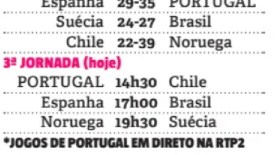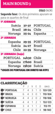 Vitória categórica de Portugal diante do frágil Chile que, embora tenha conseguido mostrar alguns argumentos na primeira parte, na segunda caiu completamente por terra. A Seleção Nacional cumpre assim o objetivo de terminar esta segunda fase do Mundial na liderança da Main Round 3 e evita, assim, a poderosa Dinamarca nos quartos de final. A equipa de Paulo Pereira vai discutir o acesso às meias-finais diante da Alemanha, na próxima quarta-feira, às 19h30.