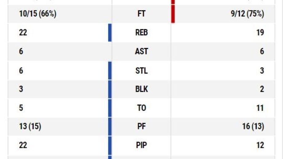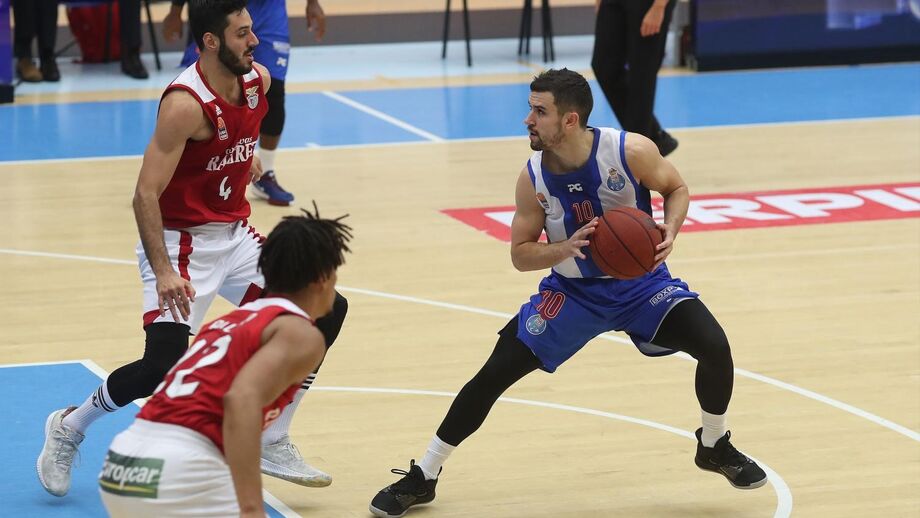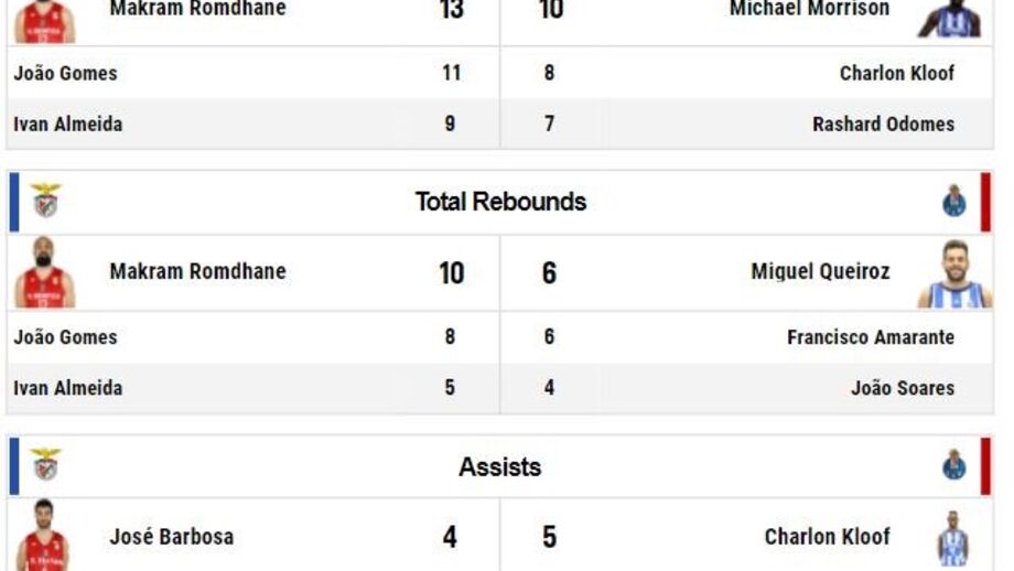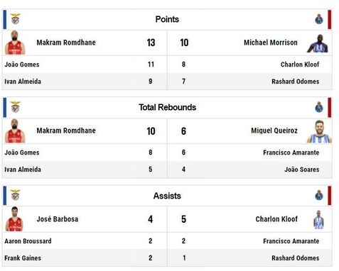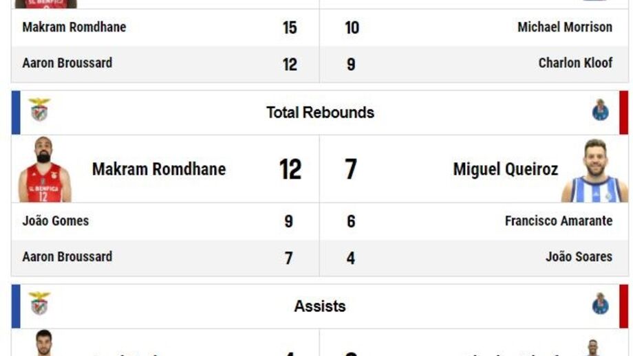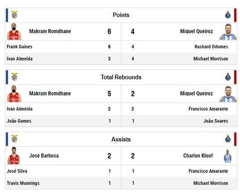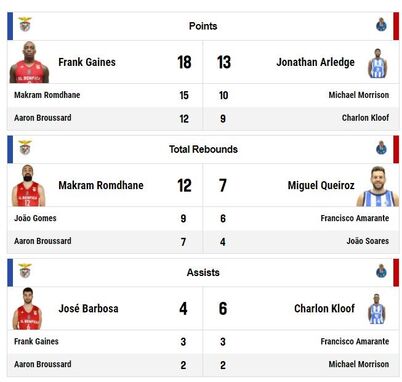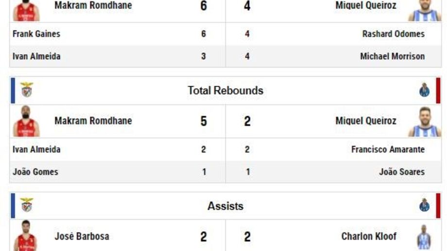 Com 11 pontos, Ben Romdhane é o melhor marcador da partida ao intervalo. Do lado do FC Porto, Miguel Queiroz destaca-se com sete pontos. A nível coletivo, as águias têm mais ressaltos mas os dragões têm melhor percentagem de lançamentos convertidos. Muito equilíbrio ao descanso.