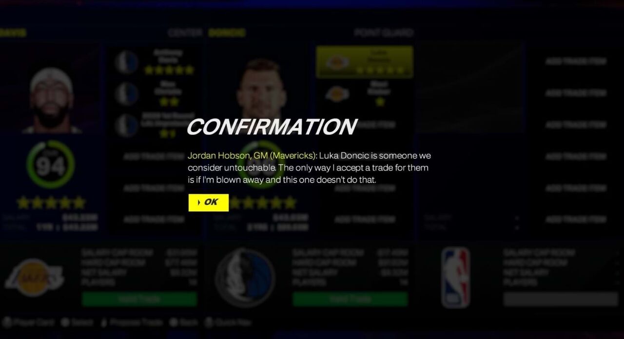 "Luka Doncic é alguém que consideramos intocável. A única forma de aceitar essa troca seria eu ficar muito impressionado e esse não é o caso", revela o GM no jogo, quando confrontado com a possibilidade.
