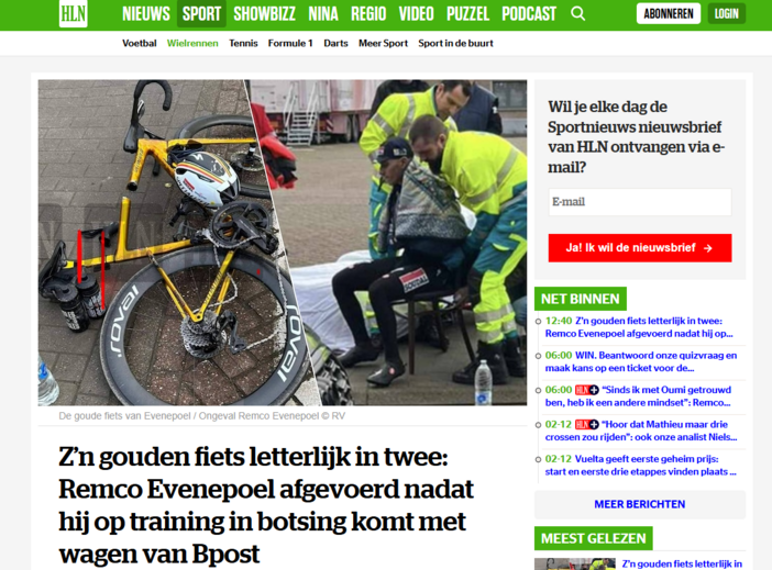 De acordo com as informações daquela publicação, Evenepoel colidiu com um carro de uma distribuidora de correio belga, a Bpost. Devido ao forte impacto, a bicicleta ficou partida ao meio.