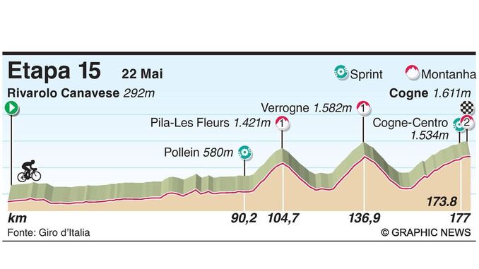 Depois de um dia de emoções fortes, com mexidas na classificação geral, incluindo um novo camisola rosa, hoje vamos ter uma etapa com muita montanha, que promete ser tão ou mais emocionante que a de ontem. Há três grandes montanhas nos últimos 80 quilómetros, com a meta a coincidir com uma contagem de 1.ª categoria. Imperdível!