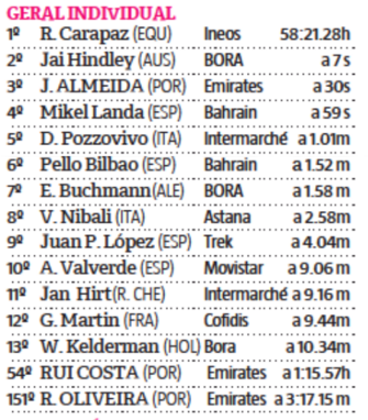 João Almeida cortou a meta em 14.º, a 7.48 minutos do vencedor. Rui Costa, que integrou a fuga, chegou no mesmo grupo do líder da UAE Team Emirates, com o mesmo tempo.