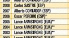 Nota (*): Em 2006 declarado vencedor após desclassificação de Floyd Landis devido a doping; em 2010 declarado vencedor após desclassificação de Alberto Contador;