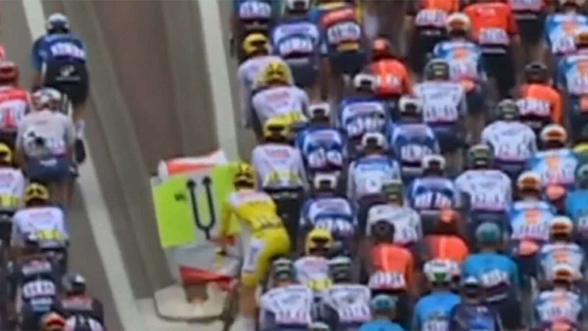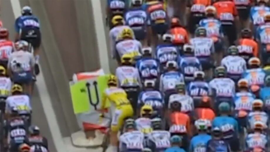 Numa etapa aparentemente tranquila no Tour'2024, Tadej Pogacar levou um valente susto quando, na passagem por uma zona com sinalização no meio da estrada, quase chocou a velocidade considerável contra um sinal. Valeu ao esloveno, que enverga a camisola amarela de líder, os incríveis reflexos.