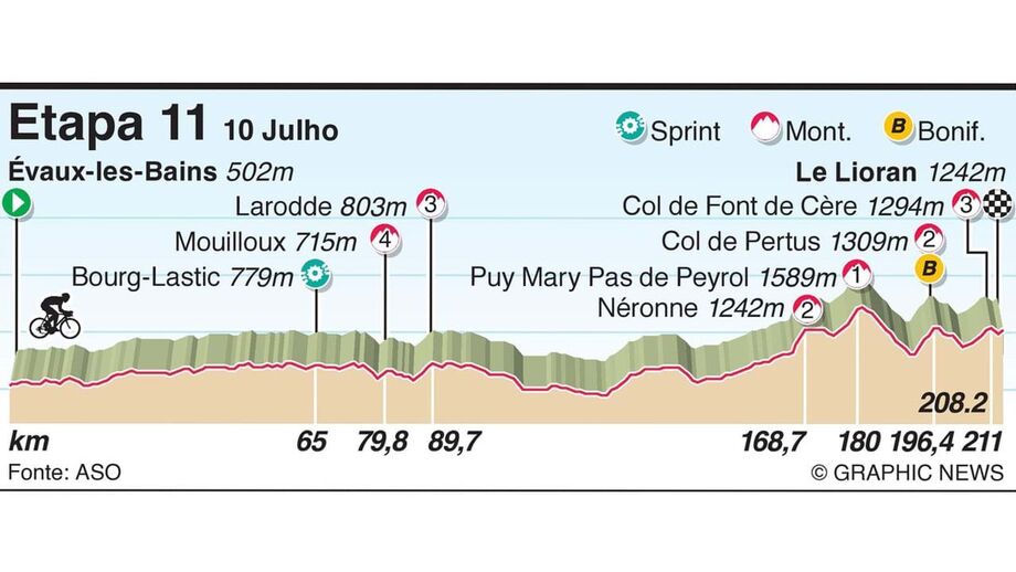 Realiza-se esta quarta-feira a 11.ª etapa do Tour, que liga Évaux-les-Bains a Le Lioran numa extensão de 211 quilómetros e que conta com a participação de três portugueses, João Almeida, Rui Costa e Nelson Oliveira. Fique por aí e acompanhe todas as incidências de mais uma prova.