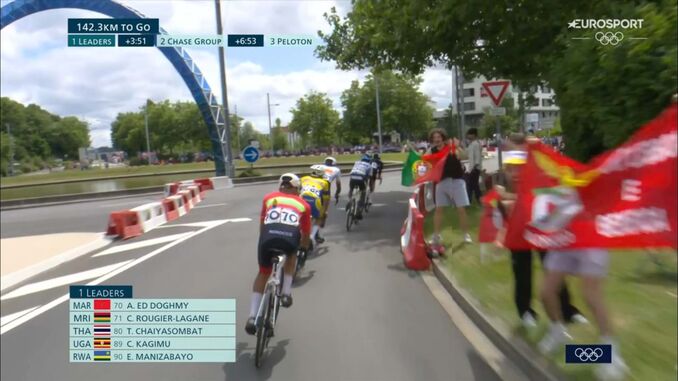 O quinteto da frente é composto por Achraf Ed Doghmy (Marrocos), Christopher Rougier-Lagane (Maurícias), Thanakhan Chaiyasombat (Tailândia), Charles Kagimu (Uganda) e Eric Manizabayo (Ruanda). São ciclistas de países de menor nomeada, que aproveitam a chance para se mostrar neste incrível palco internacional.