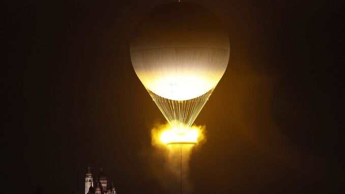 Depois de se hastear a bandeira Olímpica e de se ouvir o respetivo hino, eis que Zinedine Zidane recebe a Tocha Olímpica e poucos minutos depois entrega-a em mãos ao tenista espanhol Rafael Nadal, que entrou numa embarcação com Carl Lewis e Serena Williams, outros campeões Olímpicos, para seguir até ao destino final. Após ser transportada por diversos atletas de renome, a tocha chega ao Jardim das Tulherias e é precisamente nesse local emblemático que se acende a Chama Olímpica, subindo depois num balão de ar quente ao ponto de ficar suspensa rodeada por diversos edíficios icónicos da capital francesa. Paris transformou-se mesmo na cidade-luz.