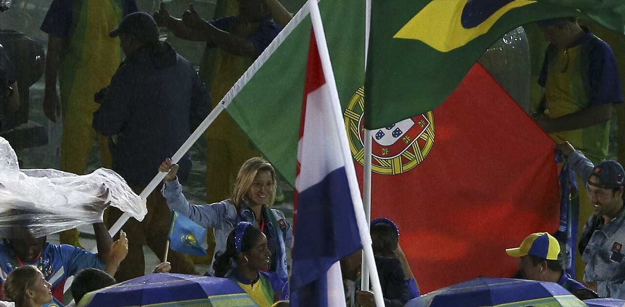 Numa mensagem de comunhão e união, todos os atletas entraram juntos, sob a bênção de Carmen Miranda e numa altura em que voltou a chover torrencialmente no Rio. As capas de chuva tomaram assim ‘de assalto’ o Maracanã, o que nem por isso acalmou a festa. Telma Monteiro levou a bandeira portuguesa.