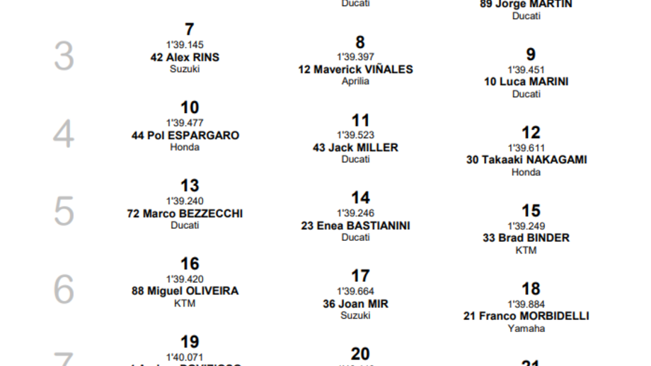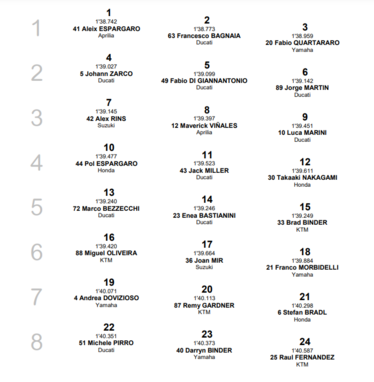 Na corrida deste domingo Miguel Oliveira vai largar da 16.ª posição, pelo que terá de fazer uma corrida de trás para a frente. Na primeira linha estarão Aleix Espargaró (Aprilia) na pole position, com Francesco Bagnaia (Ducati) e Fabio Quartararo (Yamaha), o campeão do Mundo em título.