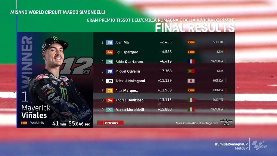 Maverick Viñales conquistou o 1.º lugar do pódio, depois de Bagnaia ter caído e abandonado a prova quando seguia na liderança. Joan Mir terminou em 2.º e Fábio Quartararo em 3.º mas teve uma penalização de 3 segundos, por exceder os limites da pista, e foi Pol Espargaró quem subiu ao terceiro lugar do pódio.