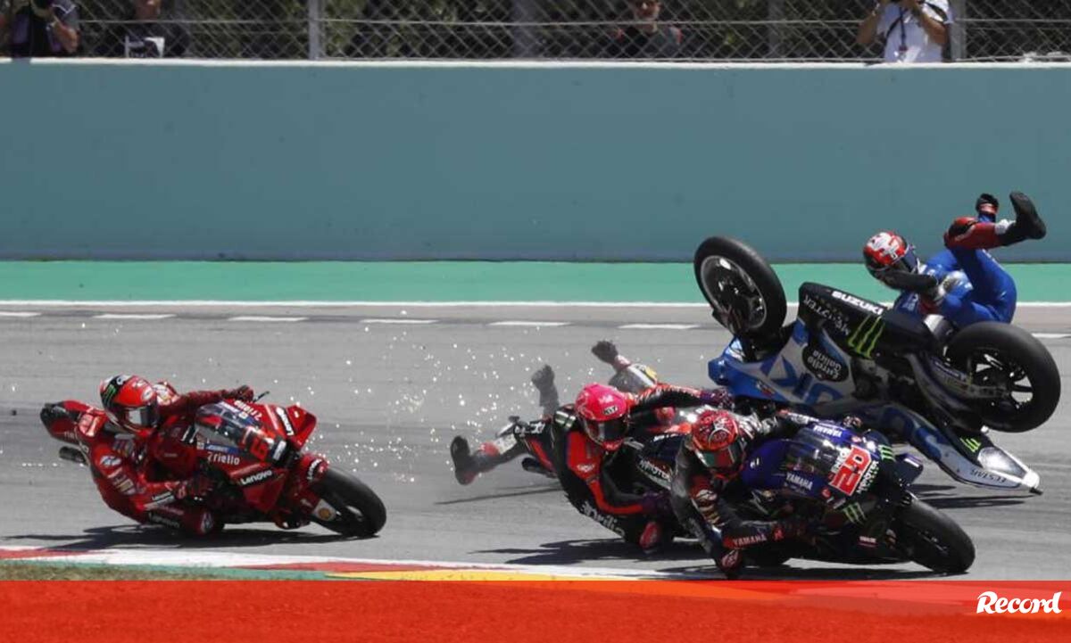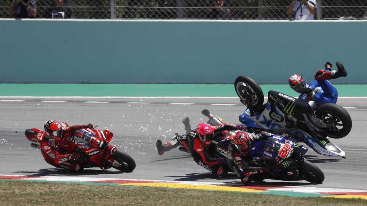O início do GP da Catalunha de MotoGP, que se realizou na tarde deste domingo e foi ganho por Fabio Quartararo, ficou marcado por uma queda conjunta logo na primeira curva de Nakagami, Bagnaia e Álex Rins, com o japonês a ser literalmente salvo... pelo capacete.
