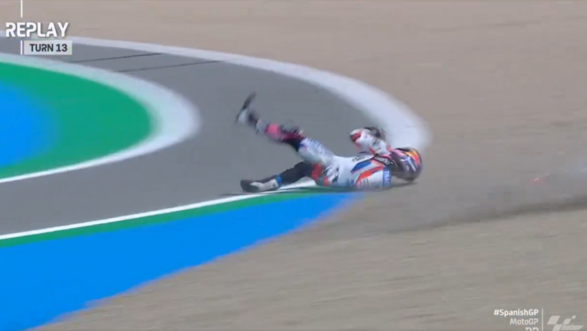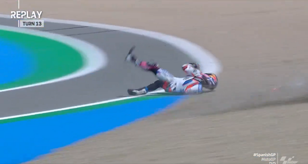 Miguel Oliveira sofreu uma queda aparatosa durante o segundo treino livre do Grande Prémio de Espanha de MotoGP, que se realizou esta sexta-feira. O piloto português, da Trackhouse Racing, perdeu o controlo da moto na curva 13 e foi projetado. Segundos depois, levantou-se e regressou às boxes.